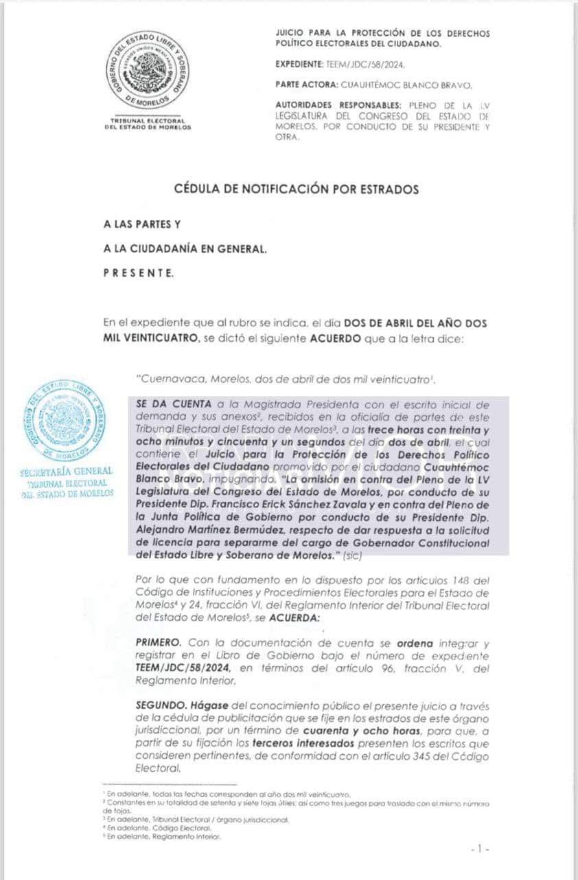 CUERNAVACA, Mor. (Agencias).- Con una mayoría absoluta de 11 votos, el Congreso del Estado de Morelos concedió licencia al gobernador Cuauhtémoc Blanco Bravo para dejar el cargo a partir del primer minuto del jueves 4 de abril y hasta las 00:00 horas del lunes 3 de junio próximo, un día después de la elección.