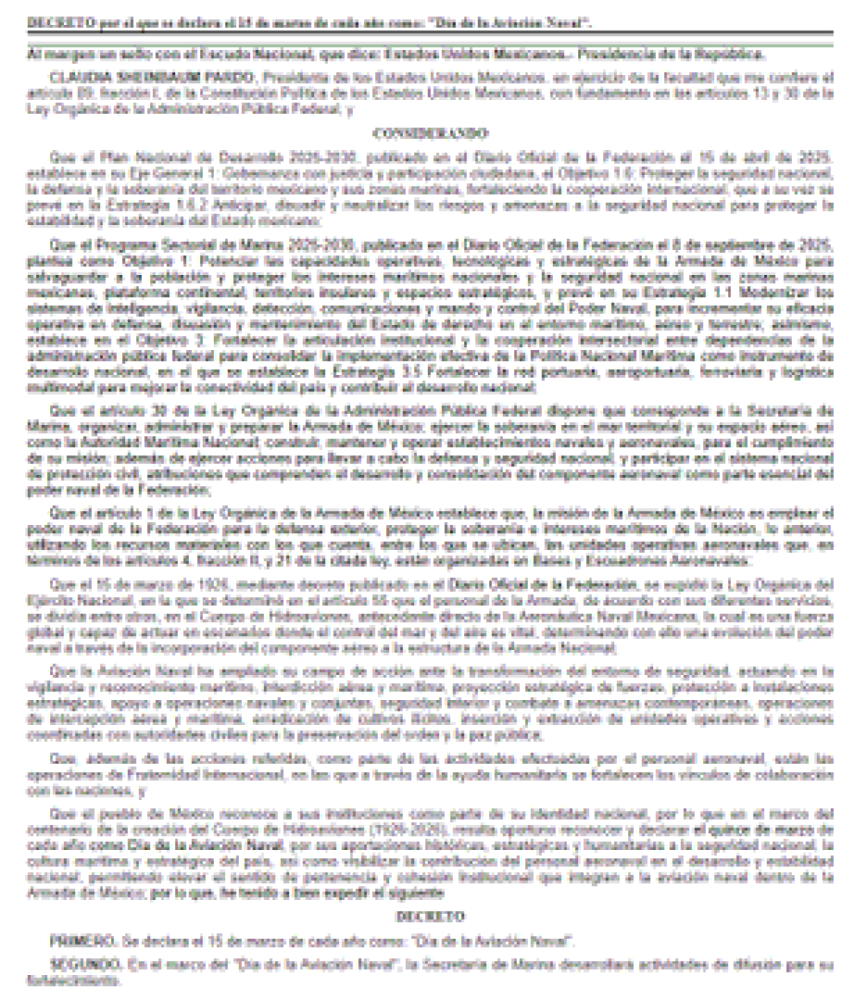 La declaratoria, próxima a su publicación en el Diario Oficial de la Federación (DOF), establece que cada año esa fecha será destinada a destacar la evolución y capacidades de las aeronaves de la Armada de México, consideradas uno de los pilares para el control del espacio marítimo nacional.