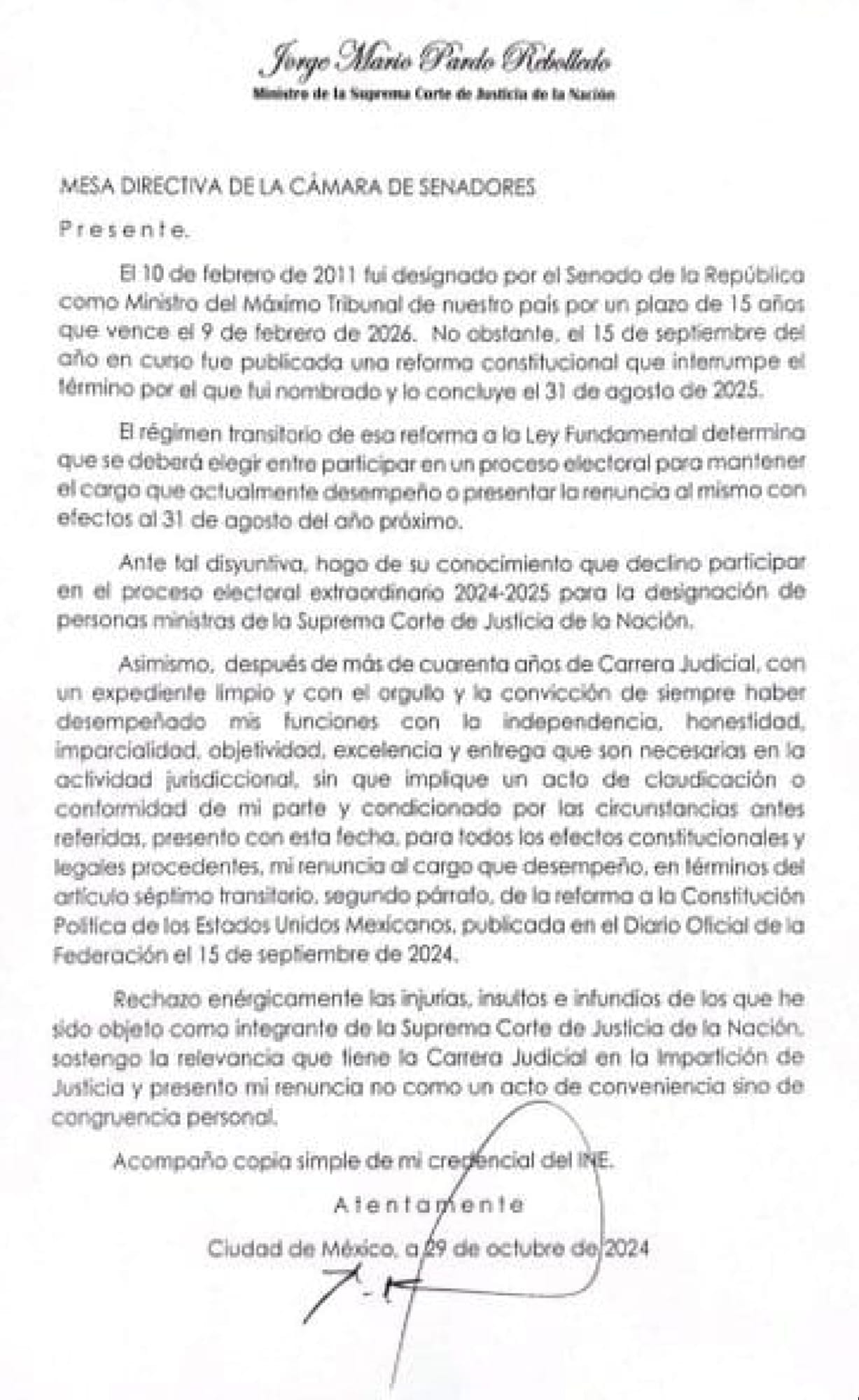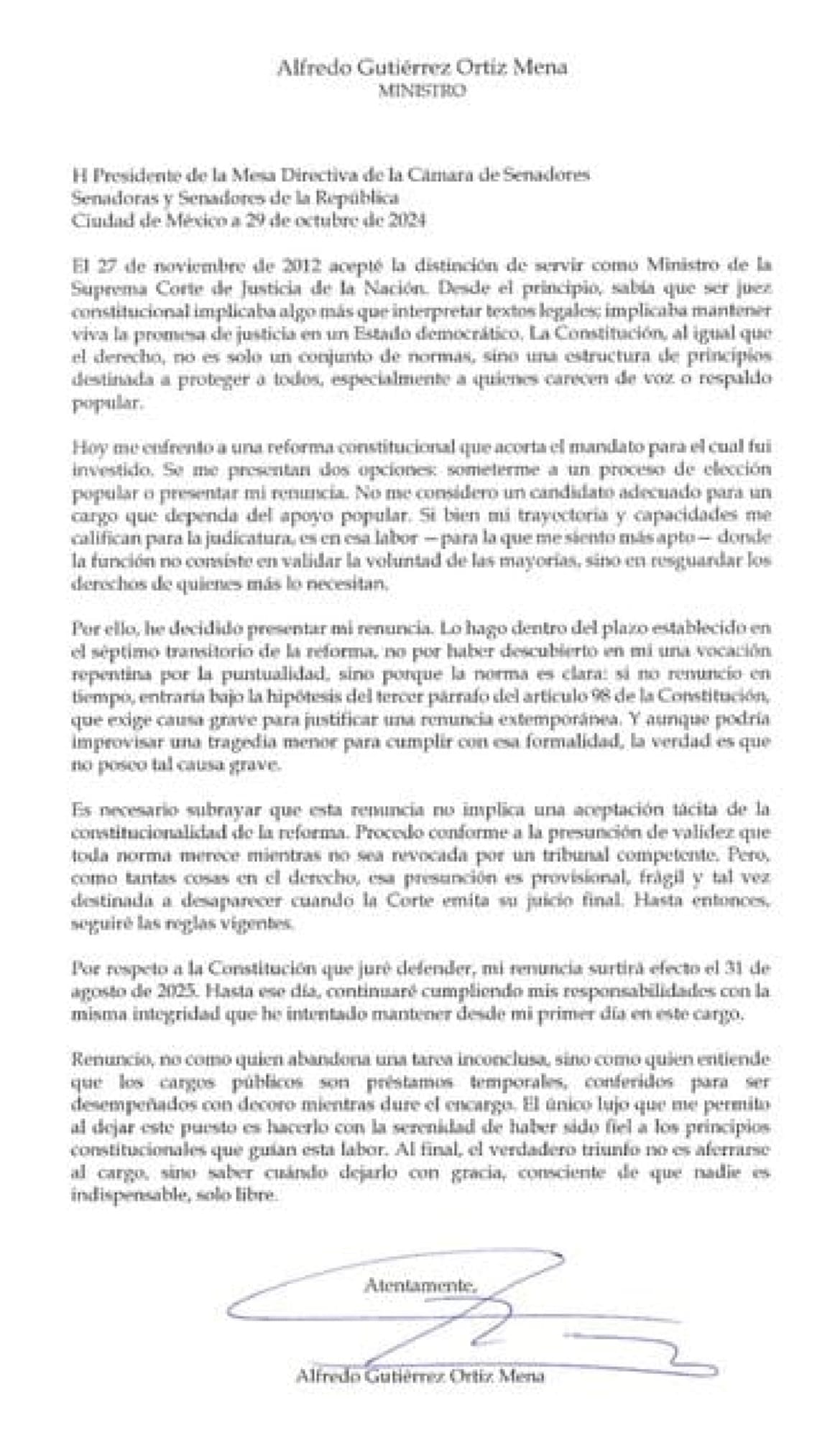 El ministro Alfredo Gutiérrez Ortiz Mena anuncia su renuncia a la #SCJN "Necesario subrayar que esta renuncia no implica una aceptación tácita de la constitucionalidad de la reforma”