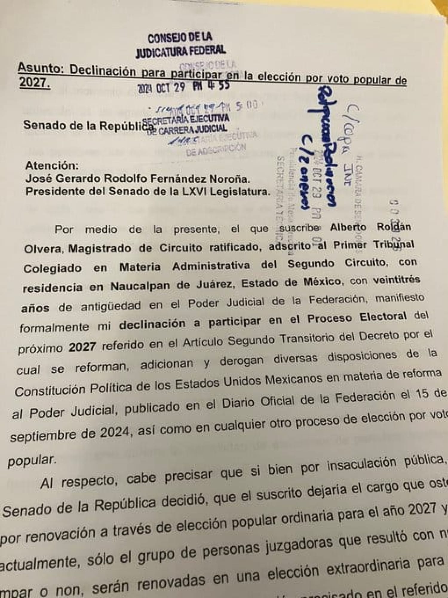 El magistrado de circuito, Alberto Roldán, presentó su declinación para contender para 2027 en la elección tras la #ReformaAlPoderJudicial “No me prestaré a esta farsa” Roldán fue quien denunció a Arturo Zaldívar de presiones a través de audios