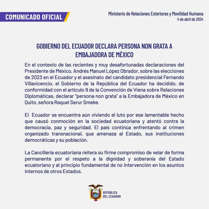 Con esta medida, el gobierno de Noboa no cesa la relación diplomática con México, pero ordena la expulsión de Serur y exige a México el respeto del “principio fundamental de no intervención en los asuntos internos de otros Estados”.