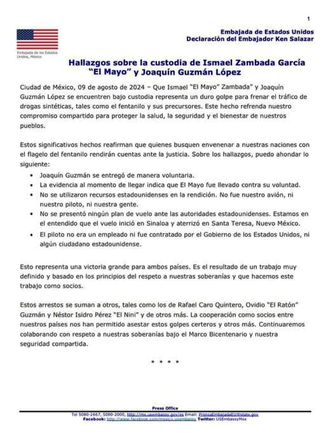 El embajador de Estados Unidos en México, Ken Salazar, aseguró este viernes que “El Mayo” Zambada fue llevado “contra su voluntad “a territorio estadunidense, y que su acompañante, Joaquín Guzmán López, sí se entregó.