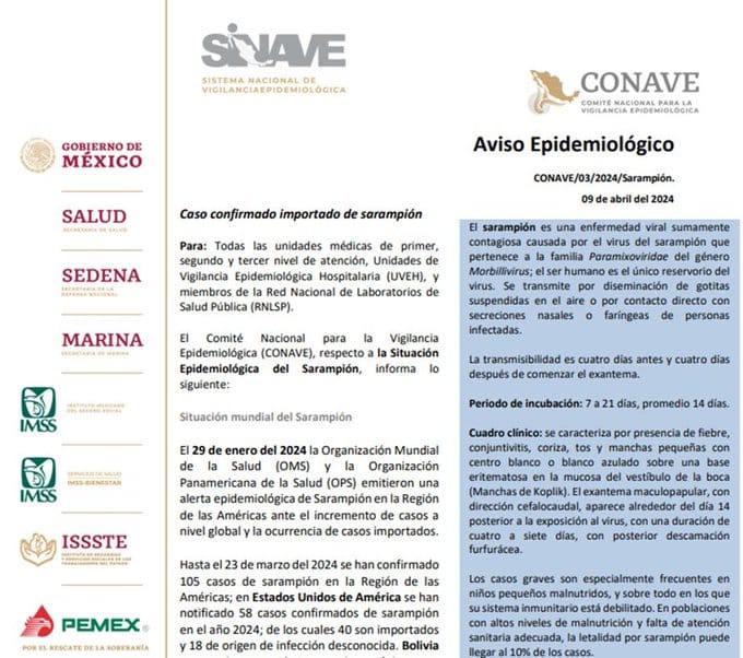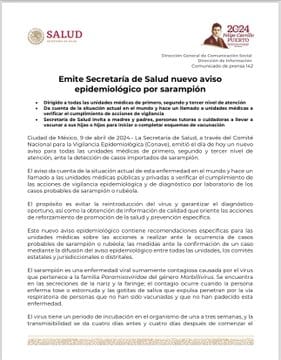 CIUDAD DE MÉXICO.-La Secretaría de Salud emitió un nuevo aviso epidemiológico para todas las unidades médicas de primero, segundo y tercer nivel de atención, ante la detección de casos importados de sarampión.