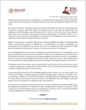“Los centros de salud de las 32 entidades federativas cuentan con vacunas triple viral contra sarampión, rubéola y paperas (SRP) para aplicarse a niñas y niños de uno a nueve años, y doble viral contra sarampión y rubéola (SR) para adolescentes de 10 a 19 años. Estas vacunas sólo se suministran a la población de las edades referidas para iniciar o completar su esquema de inmunización”, señaló la SSa.
