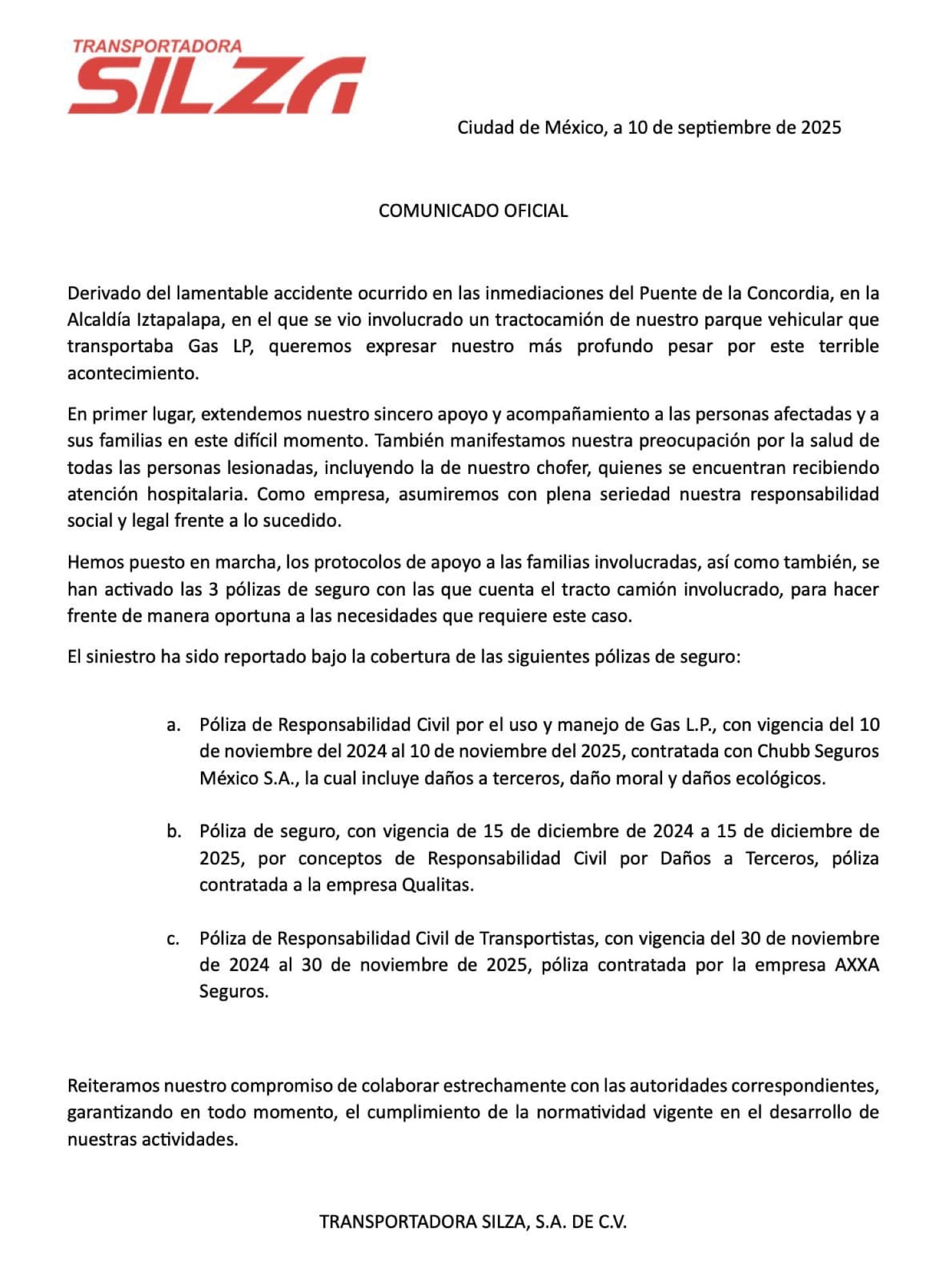 CIUDAD DE MEXICO. (Agencias).- La empresa involucrada en la explosión de la pipa en el Puente de la Concordia fue identificada como Transportadora Silza, y no contaba con pólizas de seguro de responsabilidad civil ni por daño ambiental vigentes, informó la Agencia de Seguridad, Energía y Ambiente (ASEA).