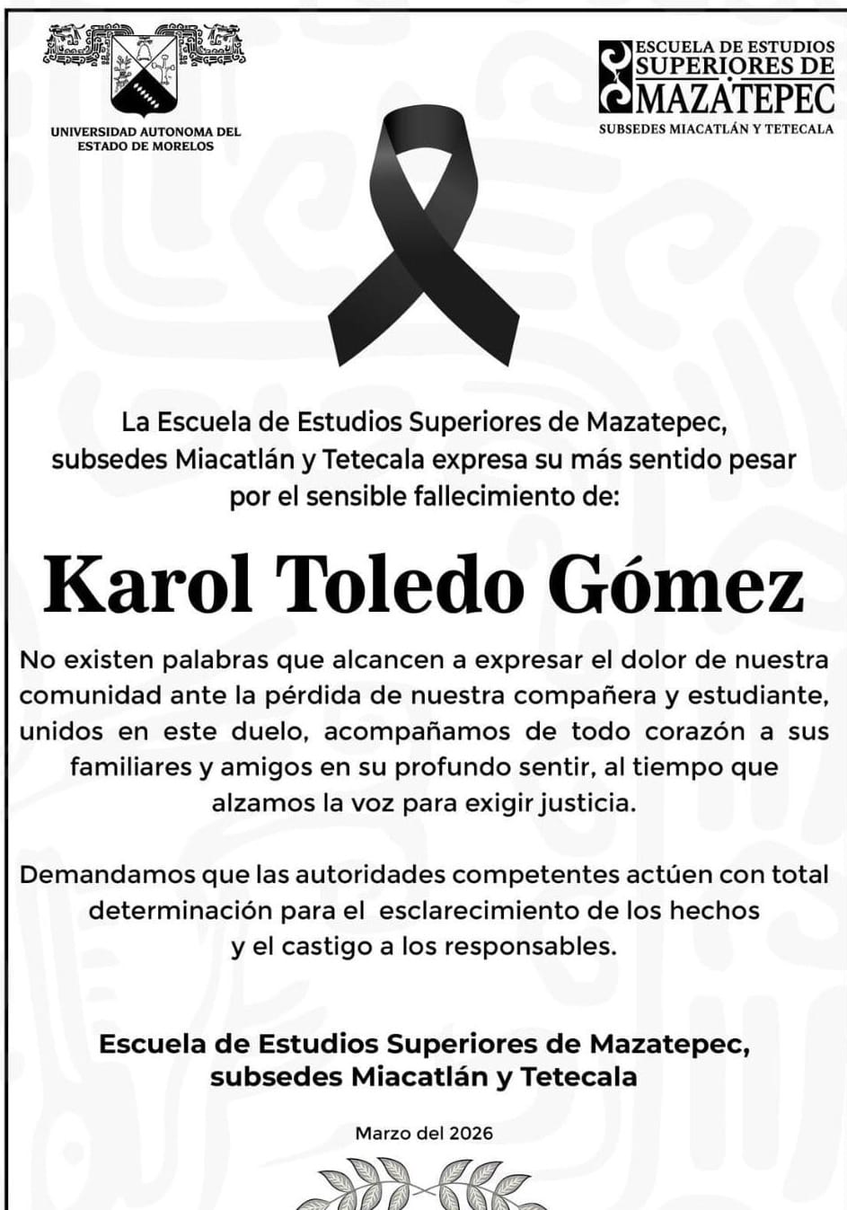 Tras el hallazgo de un cuerpo femenino con huellas de violencia, en la carretera Coatetelco-Miacatlán, a la altura de la colonia El Muelle, municipio de Coatetelco, Morelos, la comunidad de la Escuela de Estudios Superiores de Mazatepec, subsedes Miacatlán y Tetecala, emitió un comunicado en el que lamentó “el sensible fallecimiento de Karol Toledo Gómez”, alumna de la Universidad Autónoma de Morelos (UAEM), quien tenía reporte por desaparición desde el 2 de marzo,