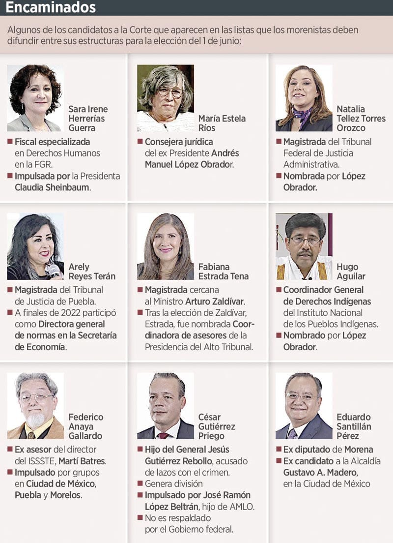 De acuerdo con líderes estatales de ese partido y funcionarios del Gobierno federal, sí existe la instrucción de apoyar a cuatro candidatas y un candidato a la Suprema Corte de Justicia de la Nación (SCJN), y garantizar que el resto sea afín a la 4T.
