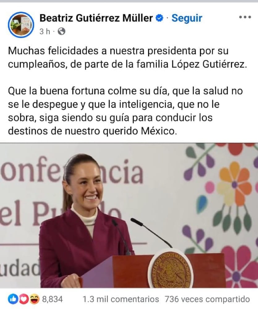 “Muchas felicidades a nuestra Presidenta por su cumpleaños, de parte de la familia López Gutiérrez”, escribió Gutiérrez Müller.