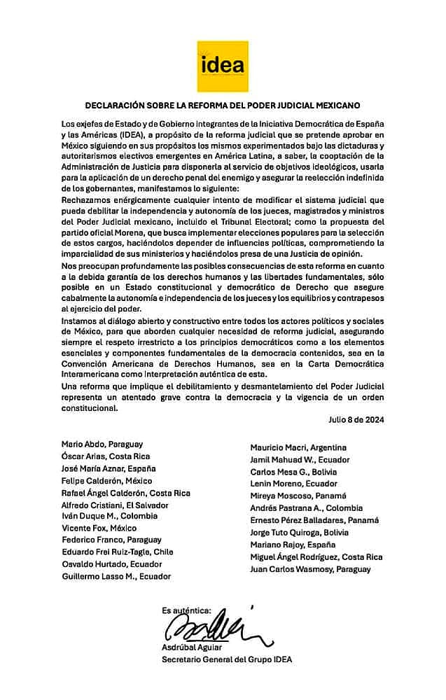 “Los exjefes de Estado y de Gobierno integrantes de la Iniciativa Democrática de España y las Américas (IDEA), a propósito de la reforma judicial que se pretende aprobar en México siguiendo en sus propósitos los mismos experimentados bajo las dictaduras y autoritarismos electivos emergentes en América Latina, a saber, la cooptación de la Administración de Justicia para disponerla al servicio de objetivos ideológicos, usarla para la aplicación de un derecho penal del enemigo y asegurar la reelección indefinida de los gobernantes, manifestamos lo siguiente: