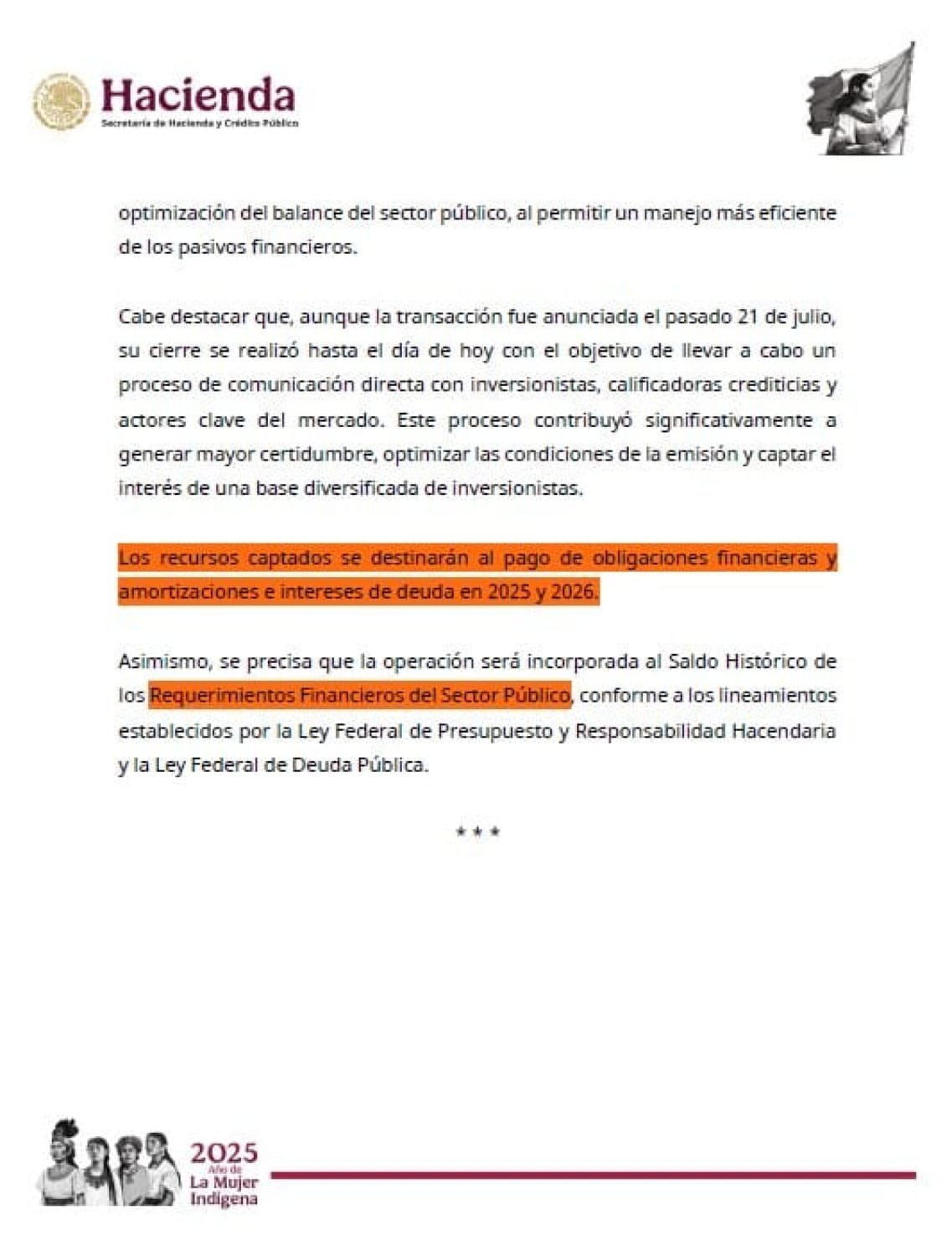 “Asimismo, se precisa que la operación será incorporada al Saldo Histórico de los Requerimientos Financieros del Sector Público, conforme a los lineamientos establecidos por la Ley Federal de Presupuesto y Responsabilidad Hacendaria y la Ley Federal de Deuda Pública”, se lee en el documento.