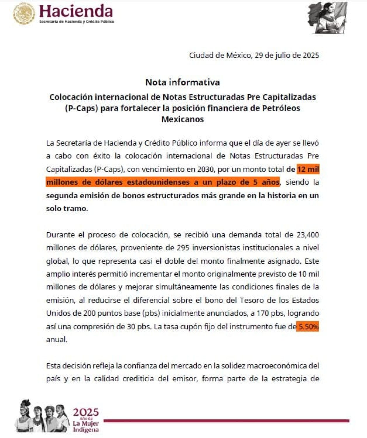 Mediante un comunicado oficial, la dependencia detalló que se concretó una colocación internacional de Notas Estructuradas Pre-Capitalizadas (P-Caps, por sus siglas en inglés), con vencimiento en 2030, por un monto total de 12 mil millones de dólares y a un plazo de cinco años.