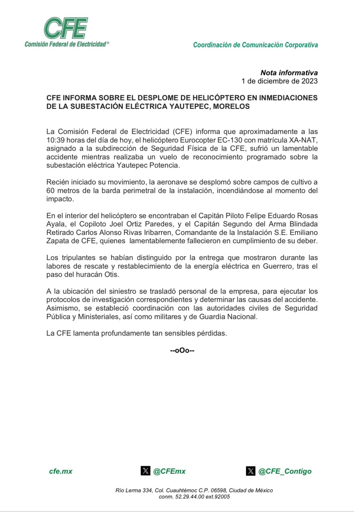 * Según la CFE, los tres trabajadores fallecidos habían estado trabajando en la recuperación de la energía eléctrica en el puerto de Acapulco, donde se registraron daños millonarios por el golpe del huracán Otis el 25 de octubre pasado.