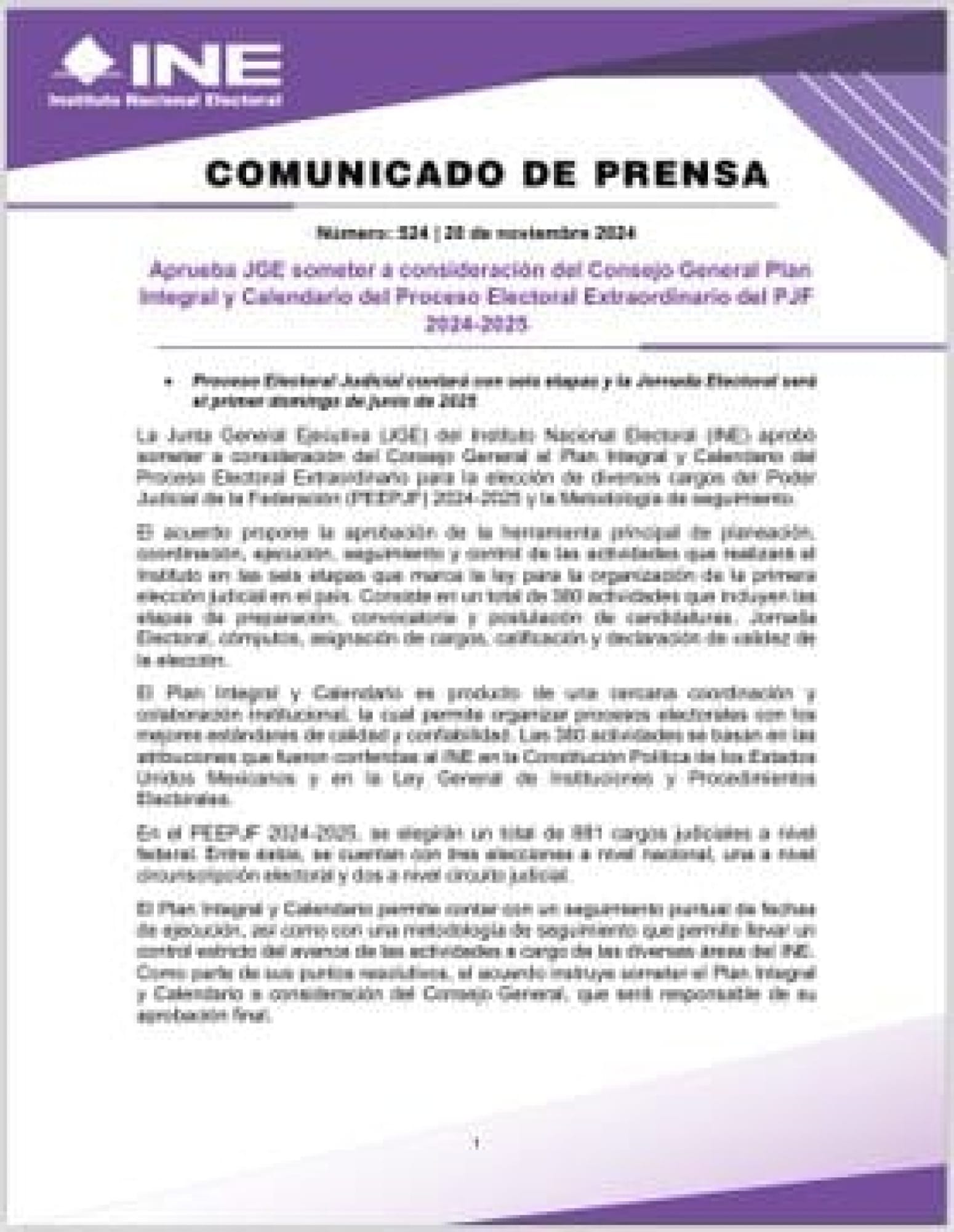 “Se propone que la jornada electoral del proceso electivo extraordinario de 2025 no se lleve a cabo el 1 de junio de 2025, sino noventa días posteriores o más”, señala el documento.