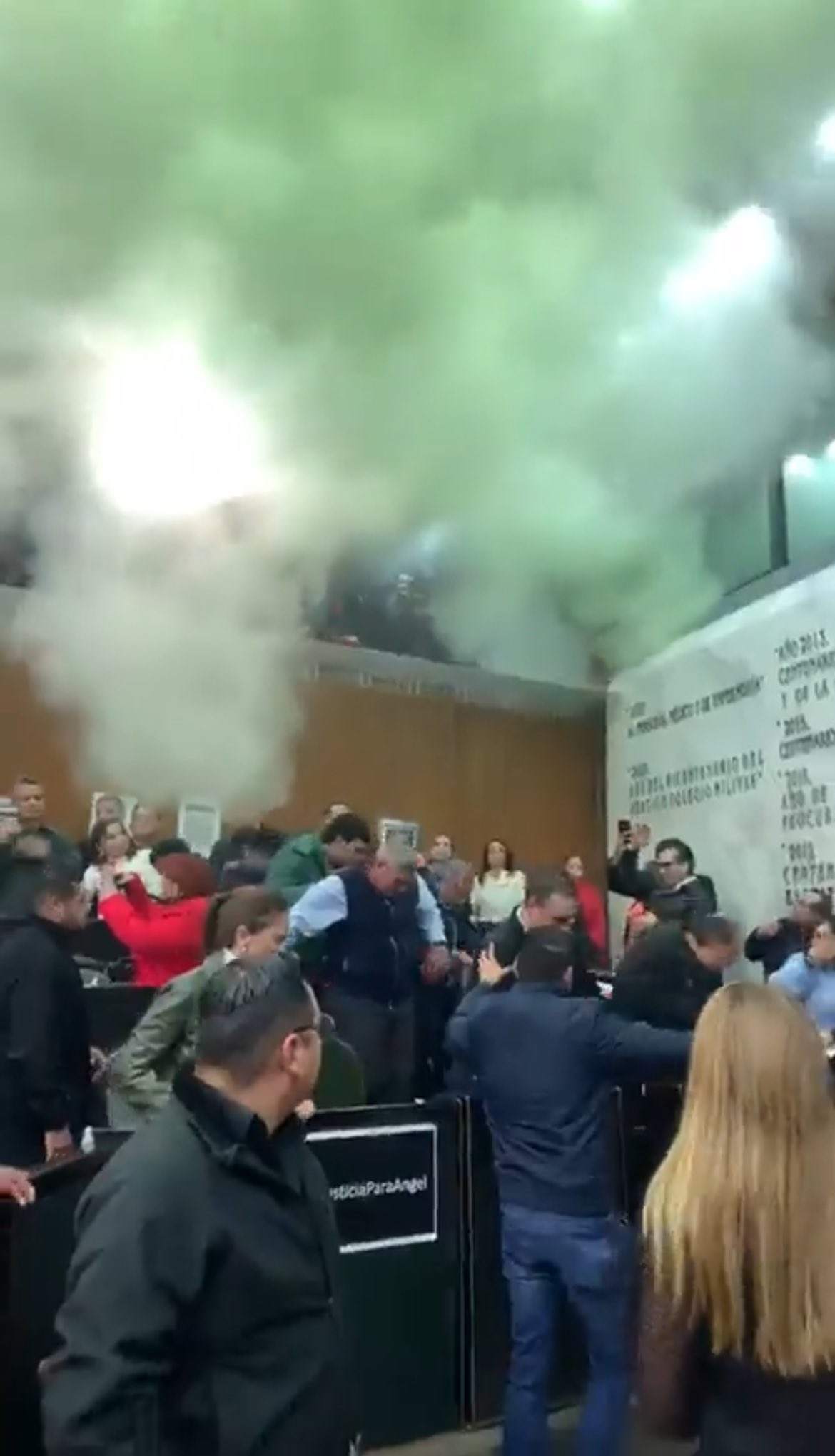 Pero la multitud que las seguía entró a empujones por la puerta de acceso al Pleno y siguieron gritando hasta que lanzaron una bomba de humo, razón por la que legisladores naranjas exigieron que se suspendiera la sesión, aunque Guerra insistía en que continuara.