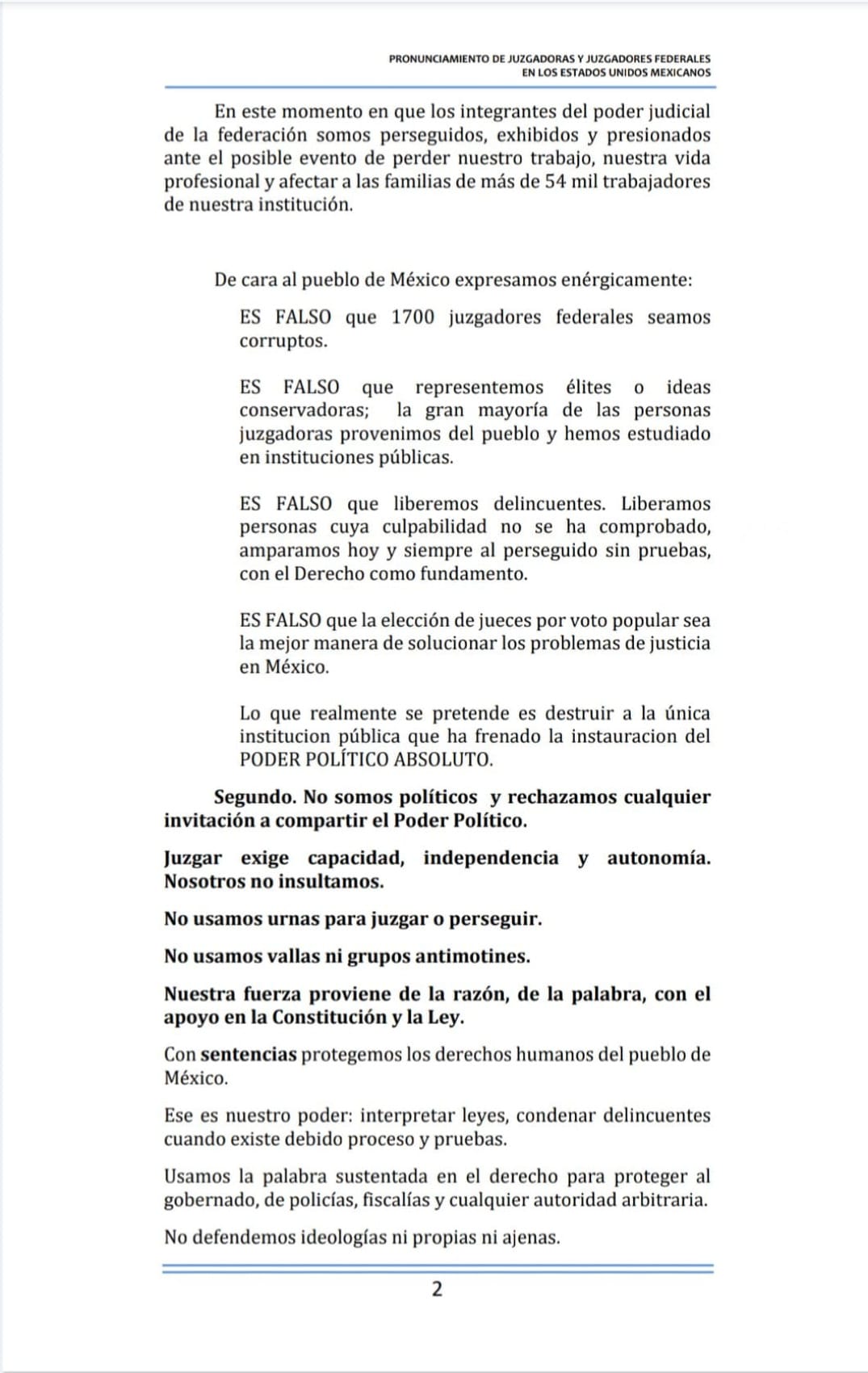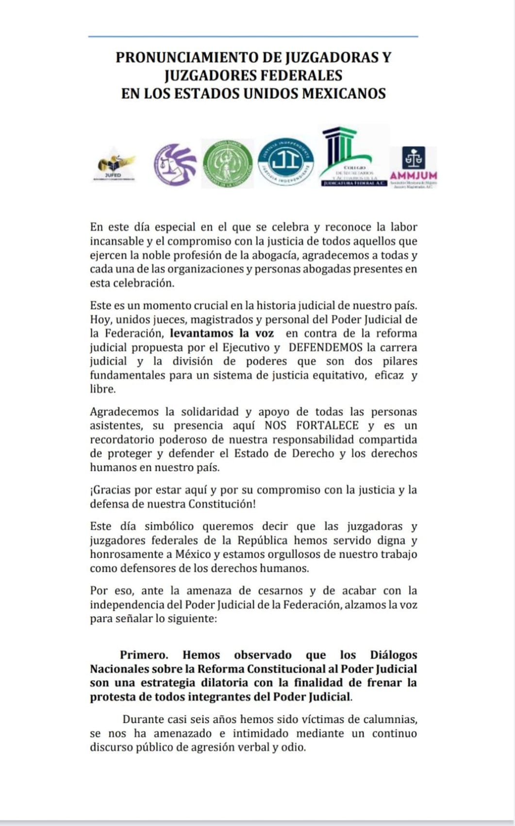 JUECES Y MAGISTRADOS FEDERALES RECHAZAN LA REFORMA JUDICIAL