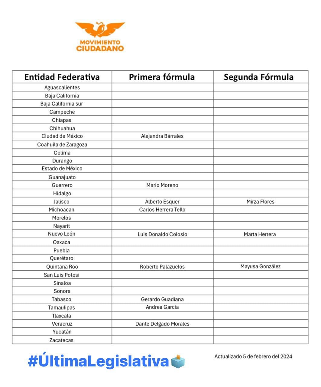 En una sesión de la Coordinadora Nacional de MC se aprobaron las listas de aspirantes al Senado y a la Cámara de Diputados vía el principio de mayoría relativa (voto popular), así como sus candidatos a la gubernatura de nueve estados de la República.