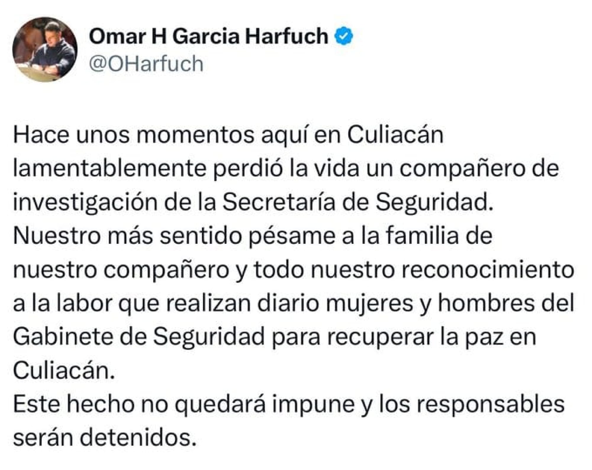 "Nuestro más sentido pésame a la familia de nuestro compañero y todo nuestro reconocimiento a la labor que realizan diario mujeres y hombres del Gabinete de Seguridad para recuperar la paz en Culiacán", escribió en su cuenta de X.