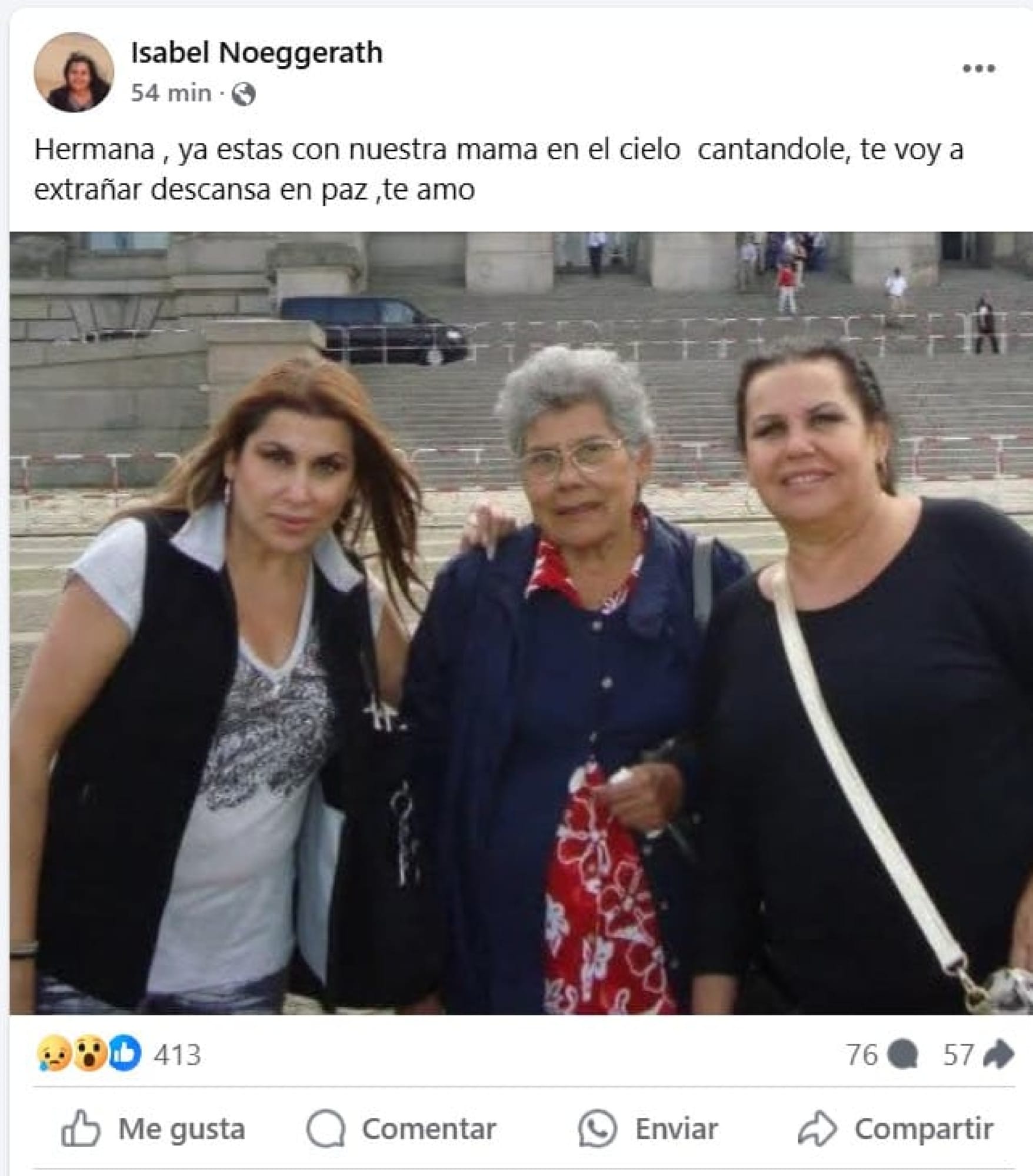 “Hermana, ya estás con nuestra mamá en el cielo cantándole, te voy a extrañar. Descansa en paz. Te amo”, se lee en la publicación, la cual, además, está acompañada de una fotografía donde aparecen las dos hermanas y su madre.
