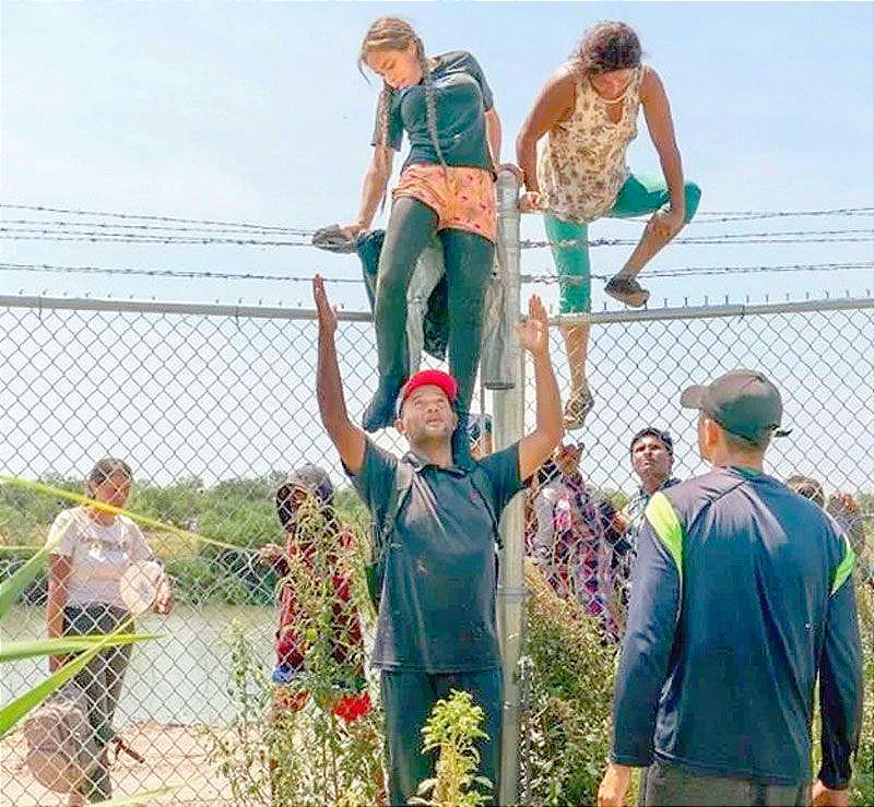 Subida en la cerca, Nataly Barrionuevo, de 39 años, espera que su esposo Wilfredo le alcance a sus hijos. Yeiden, de dos años, y Nicolás, de 7. Algunos terminan con los pantalones rasgados por los alambres, pero ya están en Estados Unidos.
