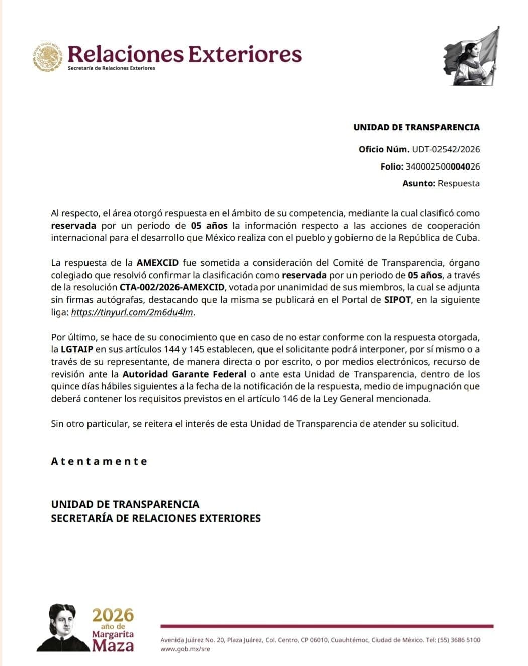 Durante su conferencia matutina desde Palacio Nacional, la mandataria afirmó que México no tiene nada que esconder respecto a la cooperación con la isla, la cual incluye ayuda humanitaria y exportaciones bajo esquemas comerciales.