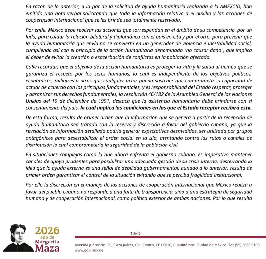 Sheinbaum reiteró que su gobierno continuará enviando apoyo al país caribeño, en línea con lo que calificó como la tradición diplomática mexicana.