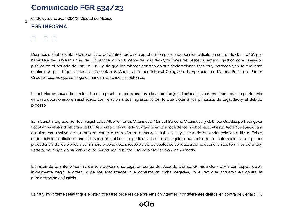 #FGRInforma | #FGR iniciará procedimiento legal en contra del Juez de Distrito, Gerardo Genaro Alarcón López, quien negó la orden de aprehensión por enriquecimiento ilícito contra de Genaro “G”, y de los Magistrados que confirmaron dicha negativa, toda vez que actuaron en contra… pic.twitter.com/6vVSZcE7fA