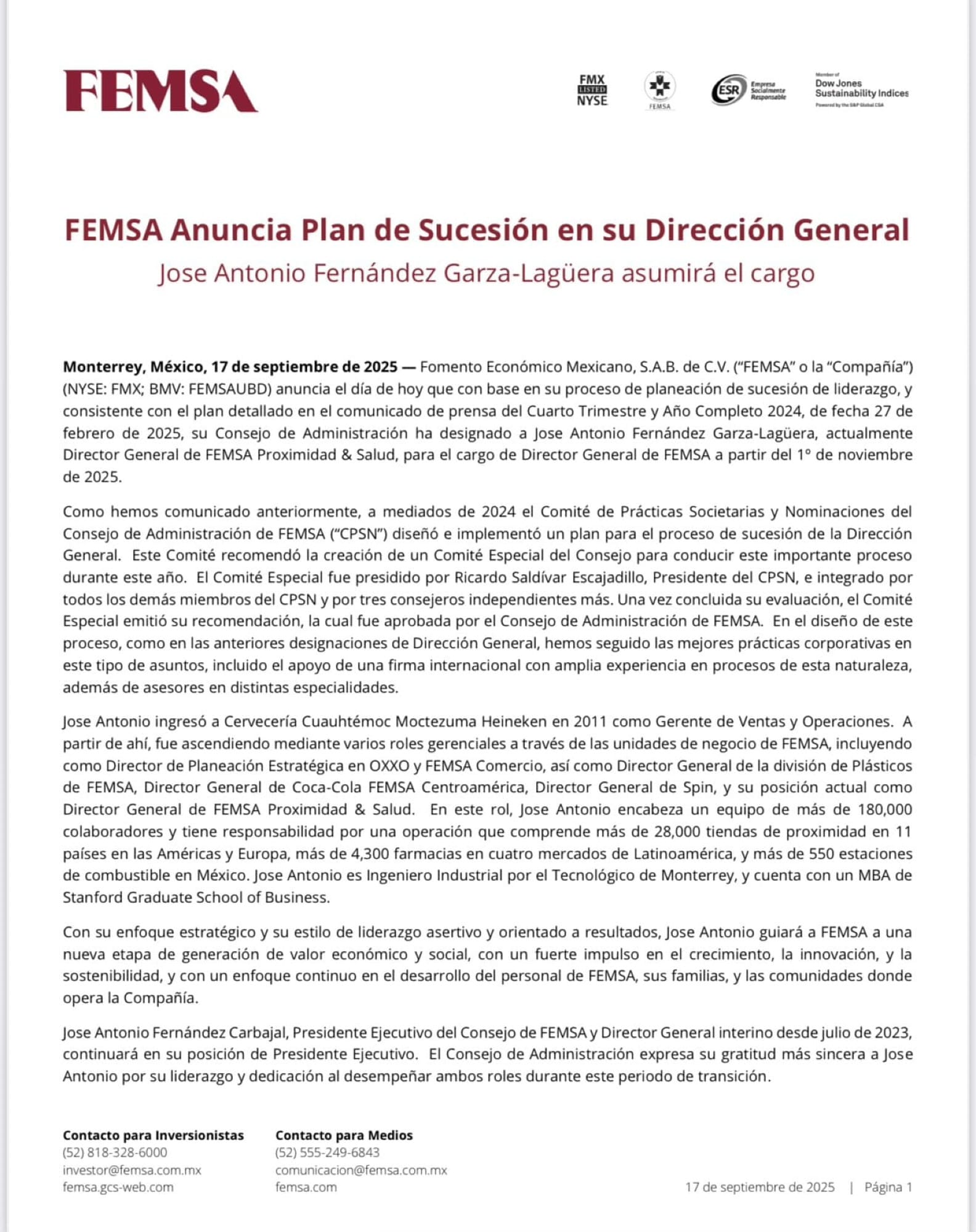 *Anunció que a partir del 1 de noviembre José Antonio Fernández Garza-Lagüera será el nuevo director general de la compañía