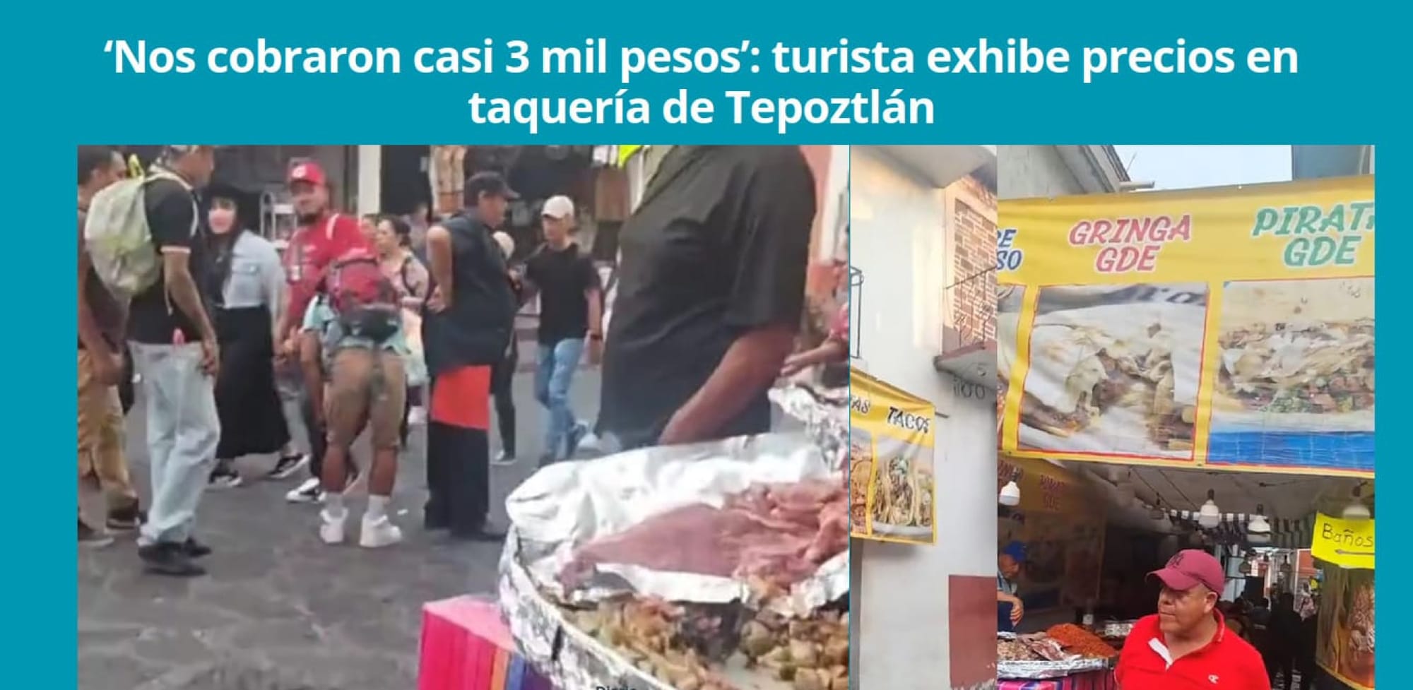 CIUDAD DE MÉXICO (apro).- Una turista de Tepoztlán, Morelos, denunció a través de redes sociales el alto costo de los alimentos en una taquería, asegurando que pagó 355 pesos por una orden de cinco tacos de cecina. La cuenta total, incluyendo bebidas, ascendió a casi 3 mil pesos, sin posibilidad de recibir factura.
