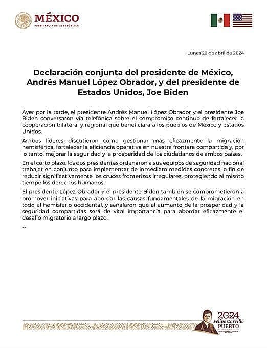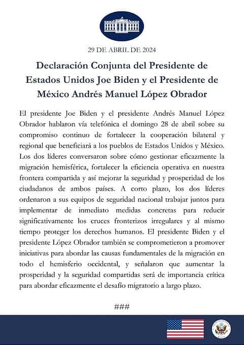 "Migración, básicamente, fue el tema, muy buena relación con el Presidente Biden, hablamos ayer al mediodía, ellos pidieron la comunicación".