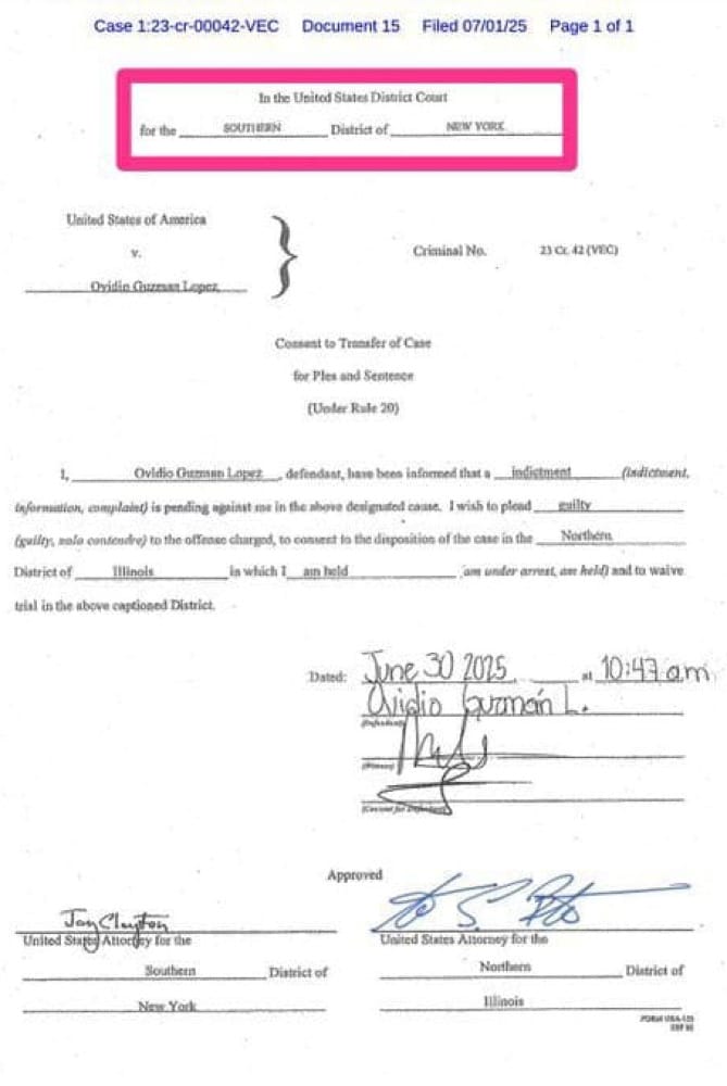 La Corte dio a conocer el documento firmado por Guzmán López, en la cual acepta su culpabilidad de los delitos que le achacan, con lo cual podrá negociar un acuerdo con la Corte para que se le reduzca la sentencia.