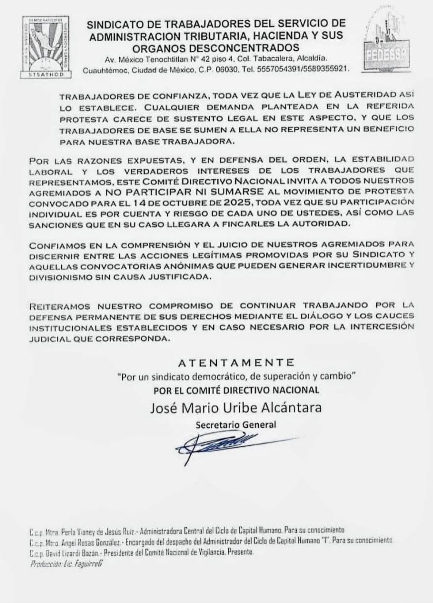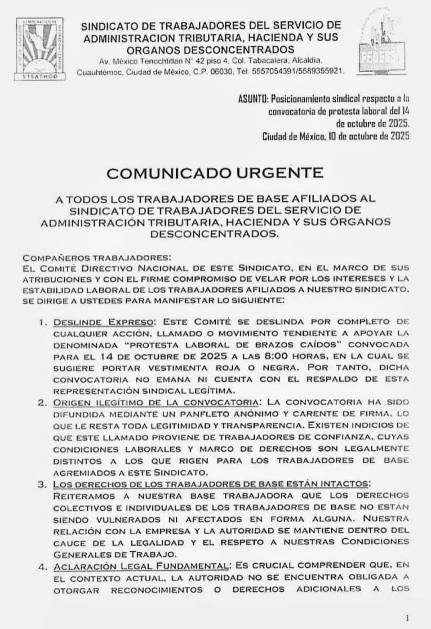 CIUDAD DE MÉXICO (Agencias).- Este martes 14 de octubre de 2025, empleados del Servicio de Administración Tributaria (SAT) realizan un paro nacional bajo la modalidad de “brazos caídos” para exigir mejoras salariales y condiciones laborales.