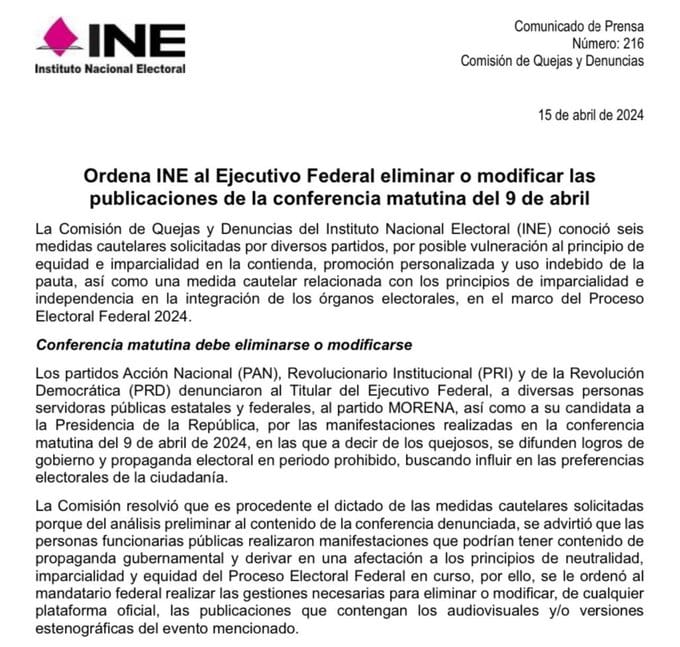 La semana pasada, el Consejo General del INE rechazó suspender la transmisión de las conferencias matutinas debido a que se interpuso esta queja y sería pronunciarse de forma anticipada.