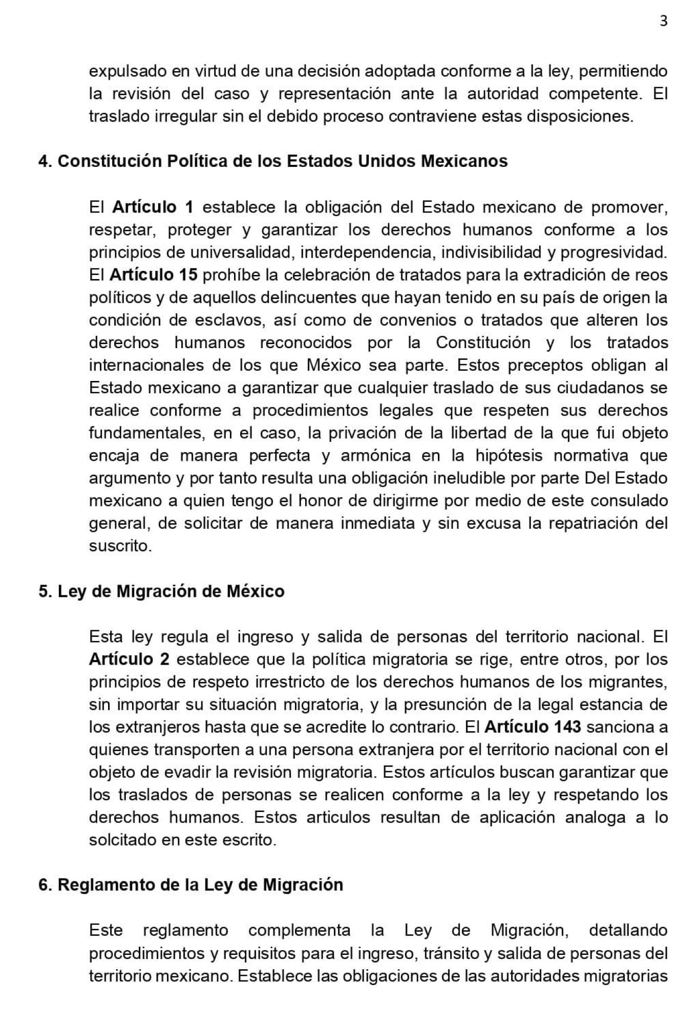 "Solicitar la repatriación inmediata de mi persona, argumentando que mi traslado fue ilegal y que cualquier proceso judicial en mi contra debe llevarse a cabo en México, conforme a las leyes nacionales y los acuerdos internacionales vigentes".