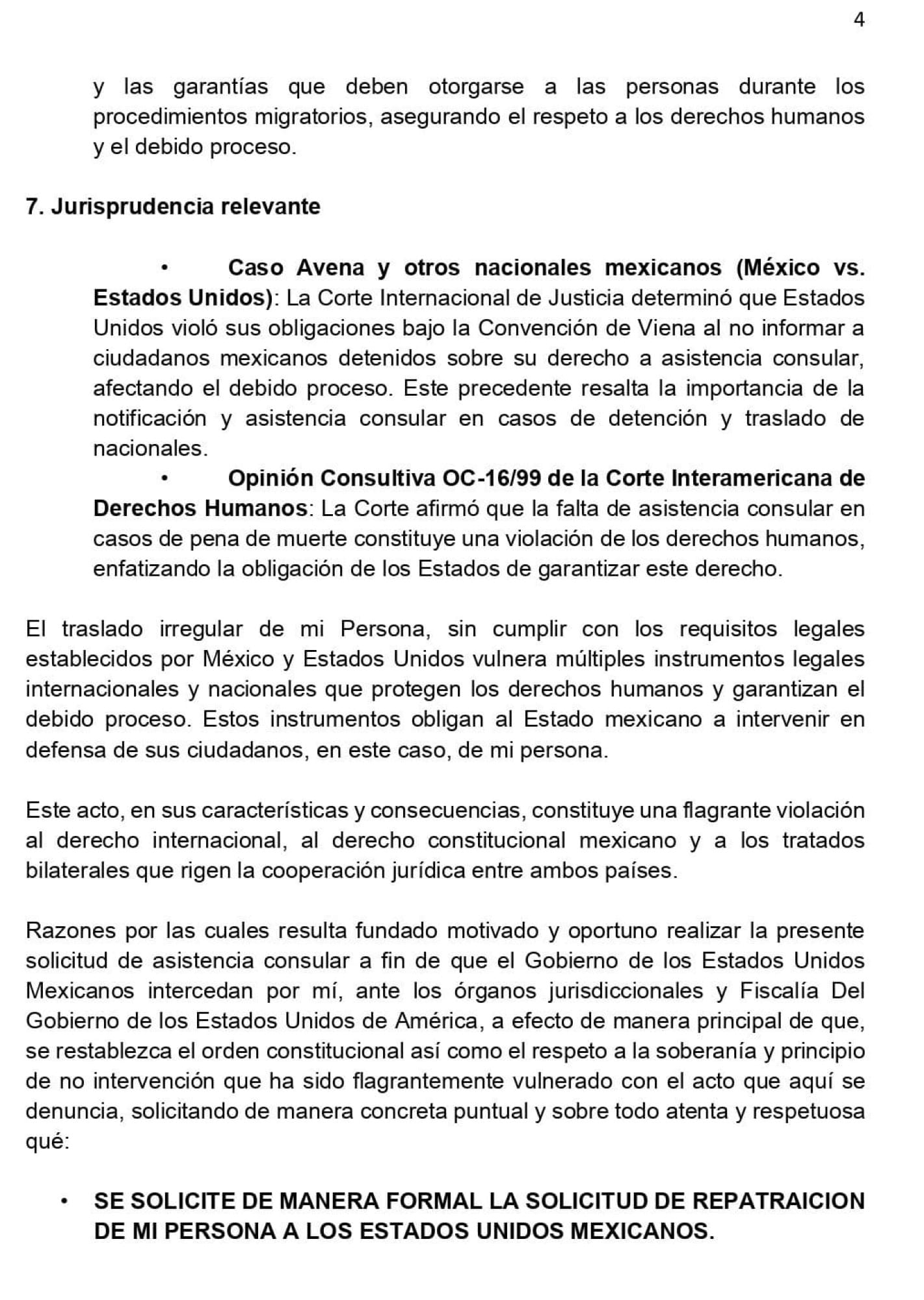 "Exijo y demando que el Estado mexicano cumpla con su obligación ineludible de intervenir de manera inmediata, contundente y sin margen de discrecionalidad para exigir formalmente a los Estados Unidos de América garantías y seguridades absolutas, plenas, vinculantes e irrevocables de que no se me impondrá ni se ejecutará la pena de muerte en su jurisdicción. Esta exigencia no es opcional, ni puede ser interpretada como una cuestión de oportunidad política o diplomática".