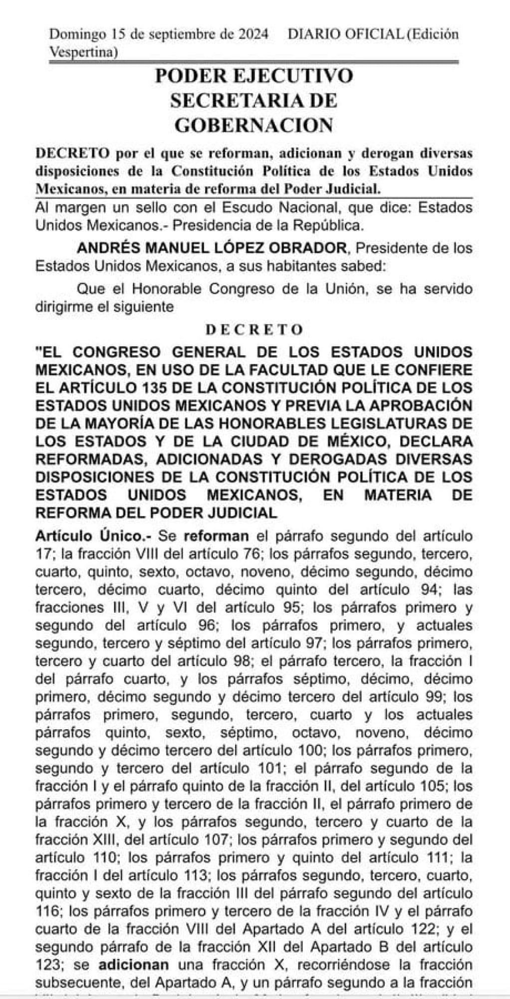La grabación del Mandatario federal fue difundida de manera paralela a la publicación digital en el DOF, que divulgó las 14 reformas, seis adiciones y tres derogaciones realizadas a 23 artículos de la Constitución, en las que se establece, entre otras disposiciones, la elección en urnas de jueces, magistrados y ministros.