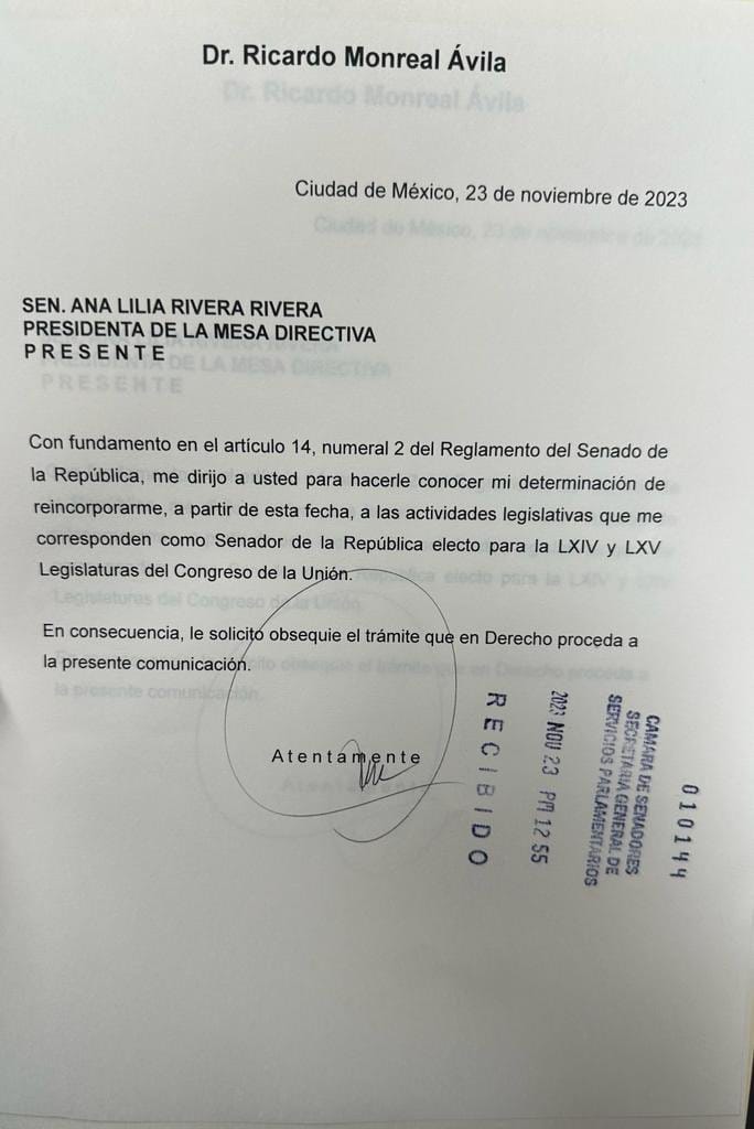 "Me dirijo a usted para hacerle conocer mi determinación de reincorporarme a partir de esta fecha a las actividades legislativas que me corresponden como senador de la República electo para la LXIV y LXV Legislaturas del Congreso de la Unión", solicitó Monreal.