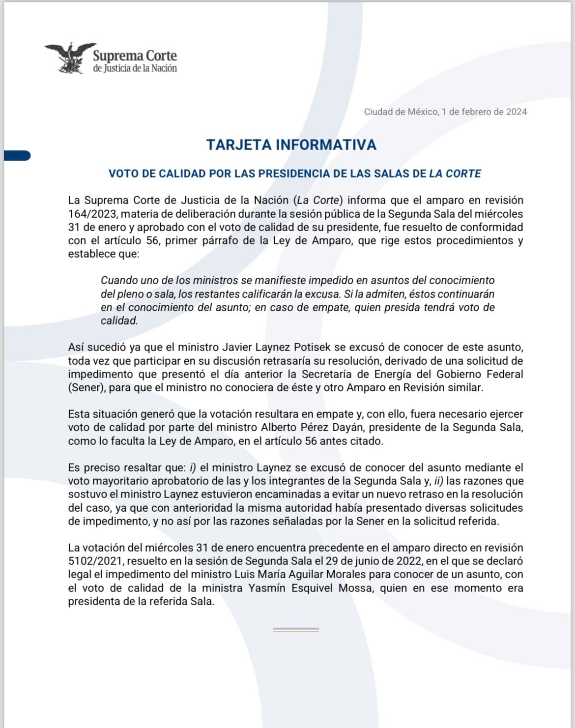 La votación tuvo un empate a dos, con Alberto Pérez Dayán y Luis María Aguilar a favor, Yasmín Esquivel y Lenia Batres en contra, y una excusa planteada por el Ministro Javier Laynez, la cual fue aprobada por tres votos contra uno.