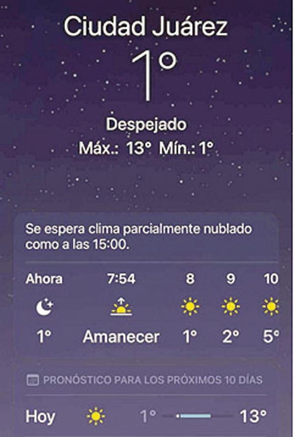 CIUDAD JUAREZ. (Agencias).- Ciudad Juárez amaneció este domingo con una temperatura de apenas 1°C y cielos completamente despejados.