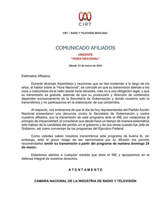 Y así, de manera unilateral, bajo un argumento inconsistente (¿cuándo han sancionado a los concesionarios por los contenidos de @lahoranacional?), la @cirtmx recomienda a sus afiliados dejar de transmitir dicho programa y hacen eco del reclamo de un partido político: pic.twitter.com/JOk2hS26cV