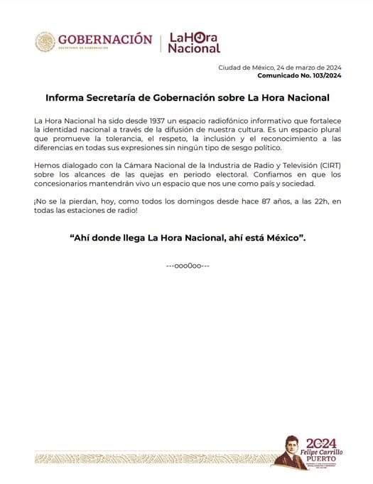 “¡No se la pierdan, hoy, como todos los domingos desde hace 87 años, a las 22:00h, en todas las estaciones de radio! ‘Ahí donde llega La Hora Nacional, ahí está México'”, concluyó.