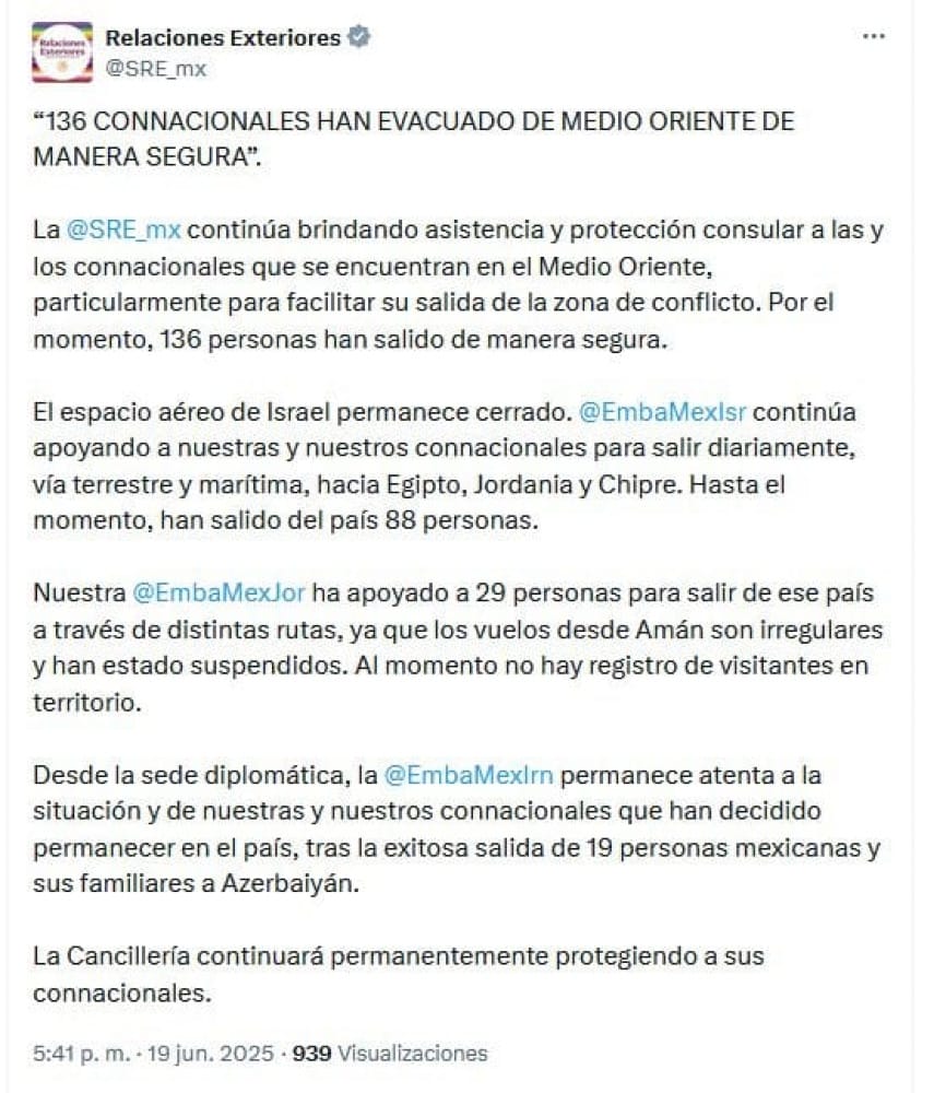 *La SRE informó que 136 mexicanos han sido evacuados de Medio Oriente debido a guerra entre Israel e Irán que ha desestabilizado a la región.