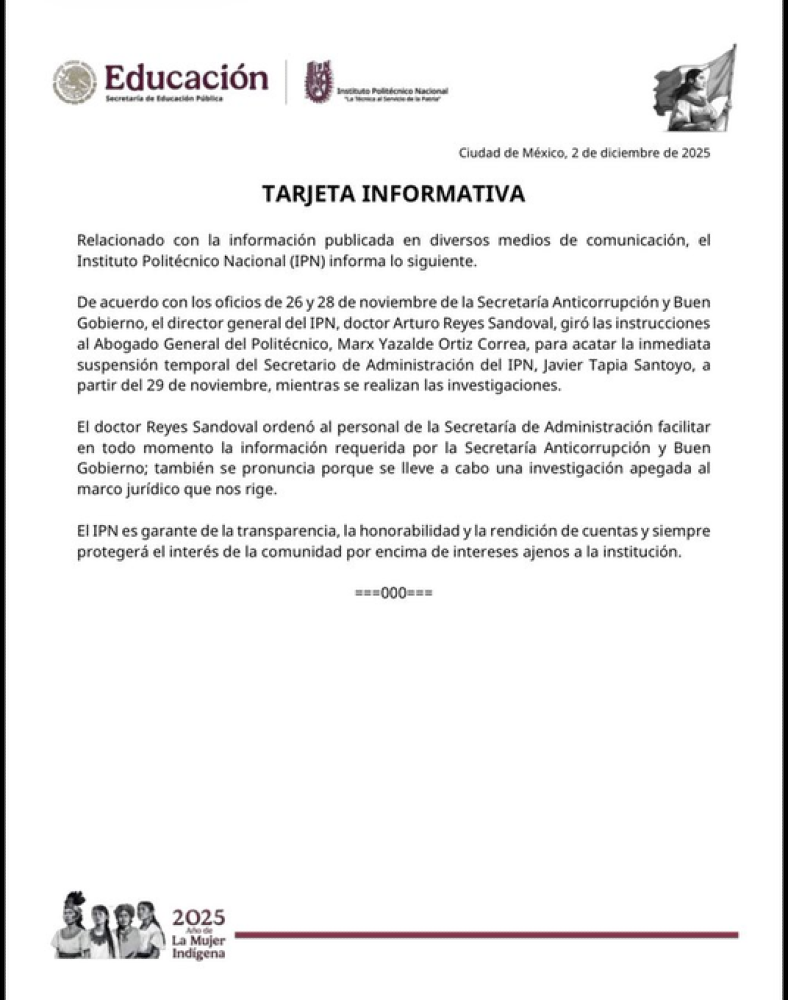 CIUDAD DE MEXICO. (Agencias).- El Instituto Politécnico Nacional (IPN) separó temporalmente del cargo al Secretario de Administración, Javier Tapia Santoyo, quien es investigado por la Secretaría Anticorrupción y de Buen Gobierno (SABG) por su presunta responsabilidad en el desvío de recursos y enriquecimiento inexplicable.