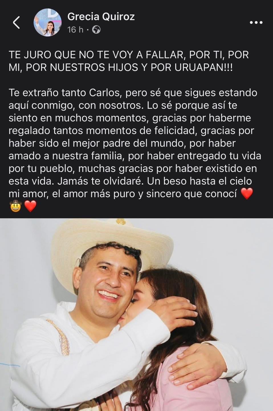URUAPAN. (Agencias).- La alcaldesa de Uruapan, Grecia Quiroz García, publicó un mensaje en memoria de su esposo, el fallecido presidente municipal Carlos Manzo Rodríguez, en el que expresó su compromiso de continuar el trabajo que él inició y de mantener viva su vocación de servicio.