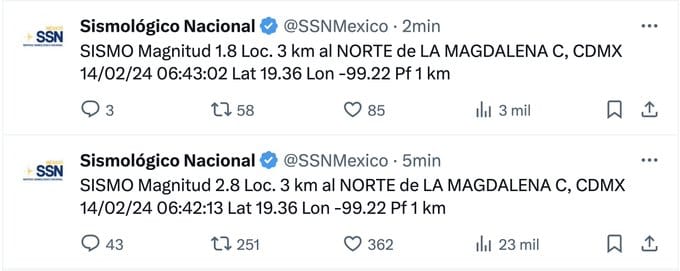 Mientras que el tercero fue a las 11:59 horas con una magnitud 1.5 “Loc. 3 km al SUR de V ALVARO OBREGÓN, CDMX 14/02/24 11:59:01 Lat 19.37 Lon -99.21 Pf 1 km”, publicó el Sismológico.