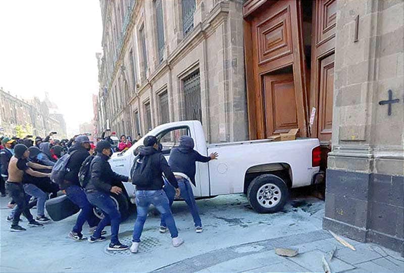 Así el impacto, con la camioneta de la CFE, en la Puerta de Acceso 1 de Palacio Nacional, sobre la calle de Moneda, en la irrupción por parte de presuntos normalistas