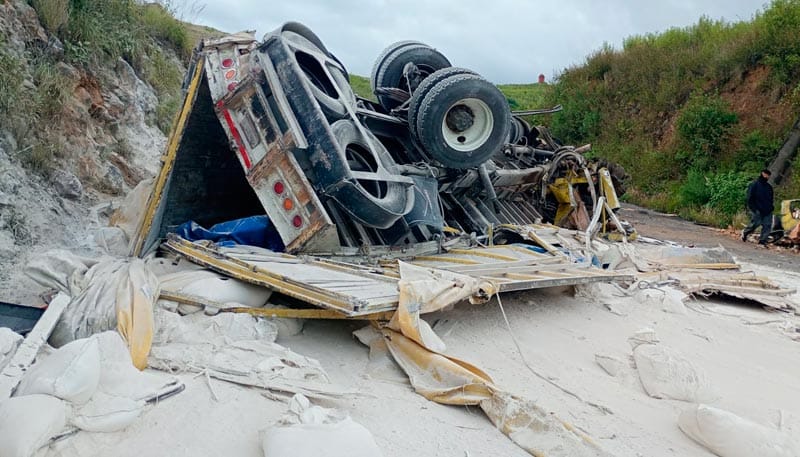 Un camión de carga tipo Torton presumiblemente se quedó sin frenos, impactó arrastró y sacó del camino a un vehículo particular, el cual terminó arriba de un cerrito, mientras que el camión sin control terminó volcando metros adelante.