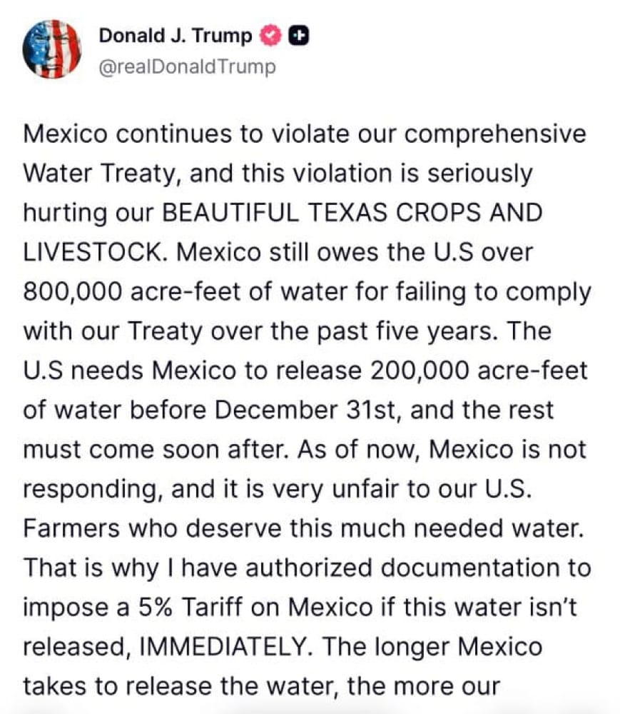Ya en abril, Trump había advertido que si México seguía incumpliendo con la cuota de agua que debía entregar, se podrían imponer “aranceles, incluso sanciones”.