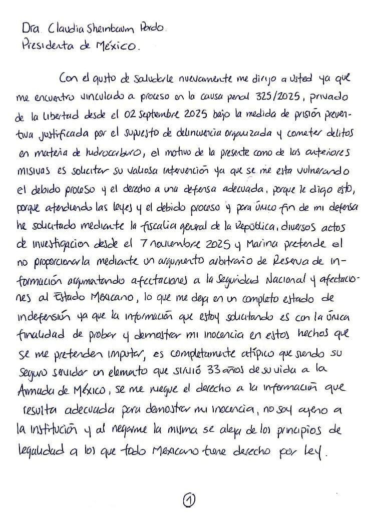 CIUDAD DE MEXICO. (Agencias).- El vicealmirante de la Secretaría de Marina, Manuel Roberto Farías Laguna, envió una cuarta carta a la presidenta Claudia Sheinbaum para solicitar su intervención en el proceso penal que enfrenta por presuntos vínculos con una red de huachicol fiscal.