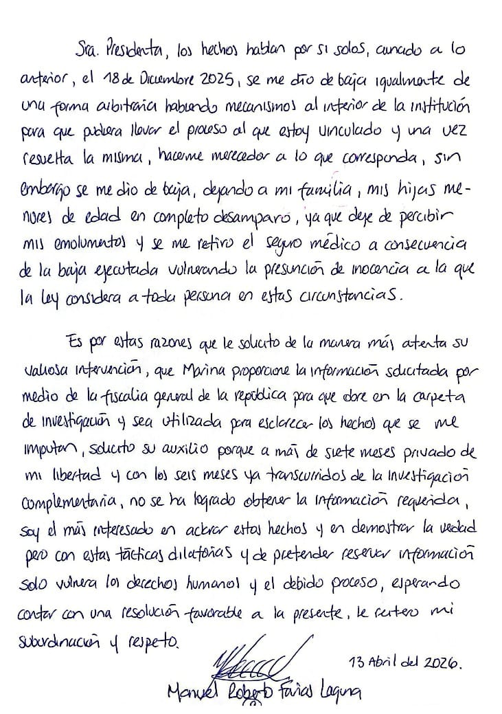 Con esta cuarta carta, Farías Laguna busca que el gobierno federal intervenga para que la Marina entregue la información solicitada a través de la FGR, con el objetivo de, según afirma, esclarecer su situación jurídica.