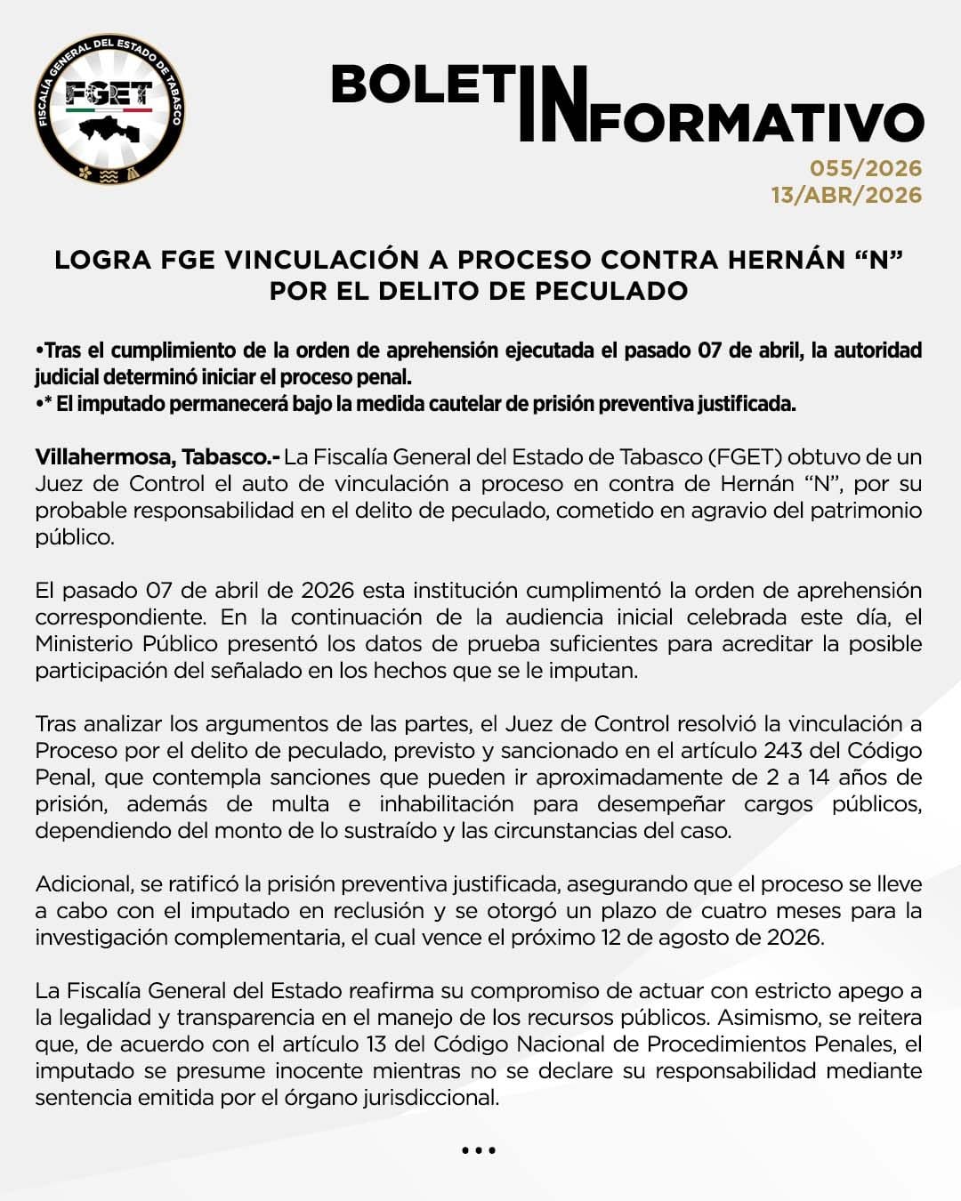 VILLAHERMOSA, Tab. (Agencias).- La Fiscalía General del Estado de Tabasco (FGET) informó que un juez de Control vinculó a proceso a Hernán “N” por su probable responsabilidad en el delito de peculado, cometido en agravio del patrimonio público.